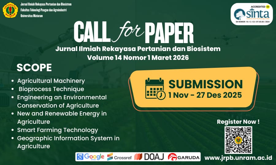 Jurnal Ilmiah Rekayasa Pertanian dan Biosistem is one of the agriculture journals in Indonesia that publishes various articles from research in the fields of agricultural and agricultural products, agricultural and bio-systems, and agroindustrial technology. This journal is mainly managed under Program Studi Teknik Pertanian (TEP) and published by Fakultas Teknologi Pangan dan Agroindustri Universitas Mataram cooperated with Perhimpunan Teknik Pertanian Indonesia (PERTETA) twice a year (March and September). Jurnal Ilmiah Rekayasa Pertanian dan Biosistem was registered with ISSN 2301-8119 (printed version) and e-ISSN number 2443-1354.